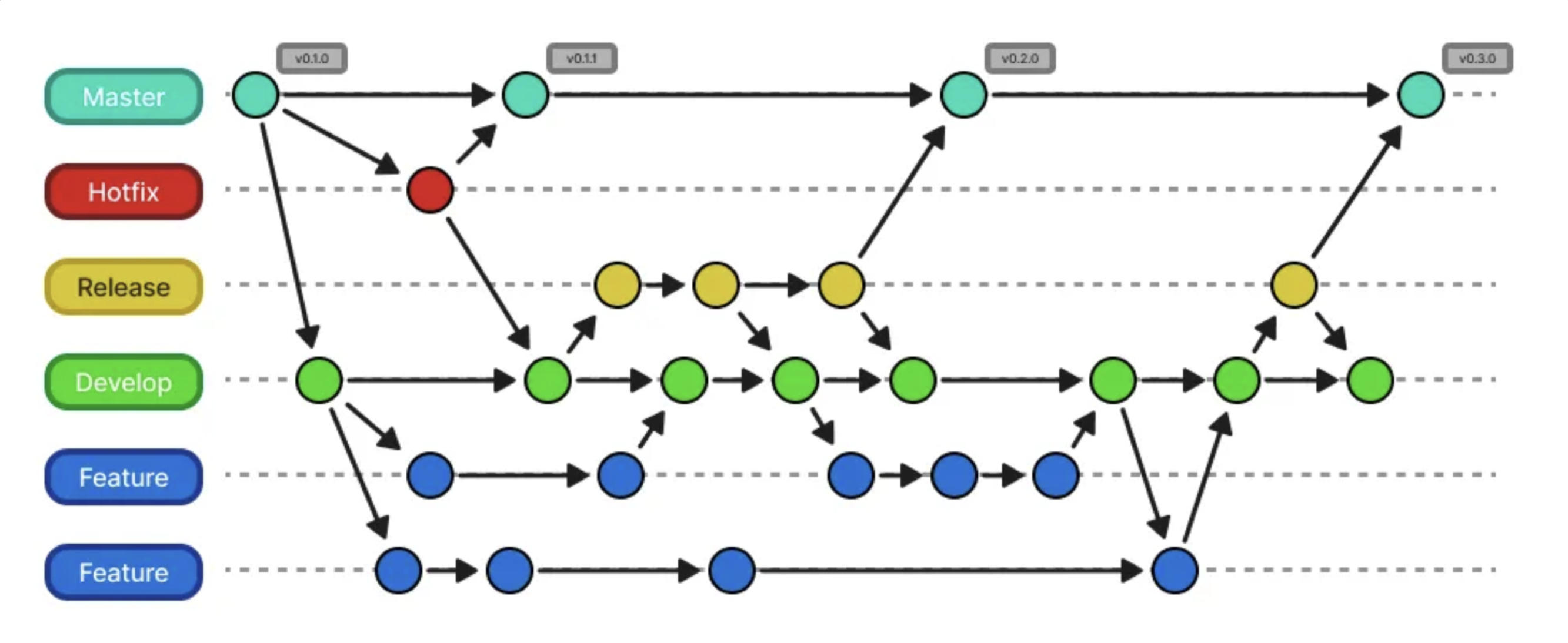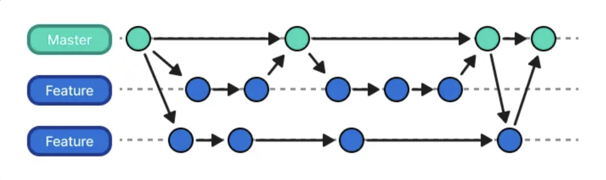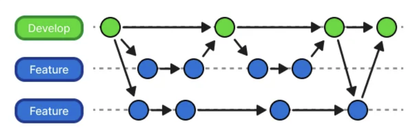 - feature 또는 release 브랜치에서 추가적인 개발이 생긴 경우 merge commit을 생성하여 병합한다.
