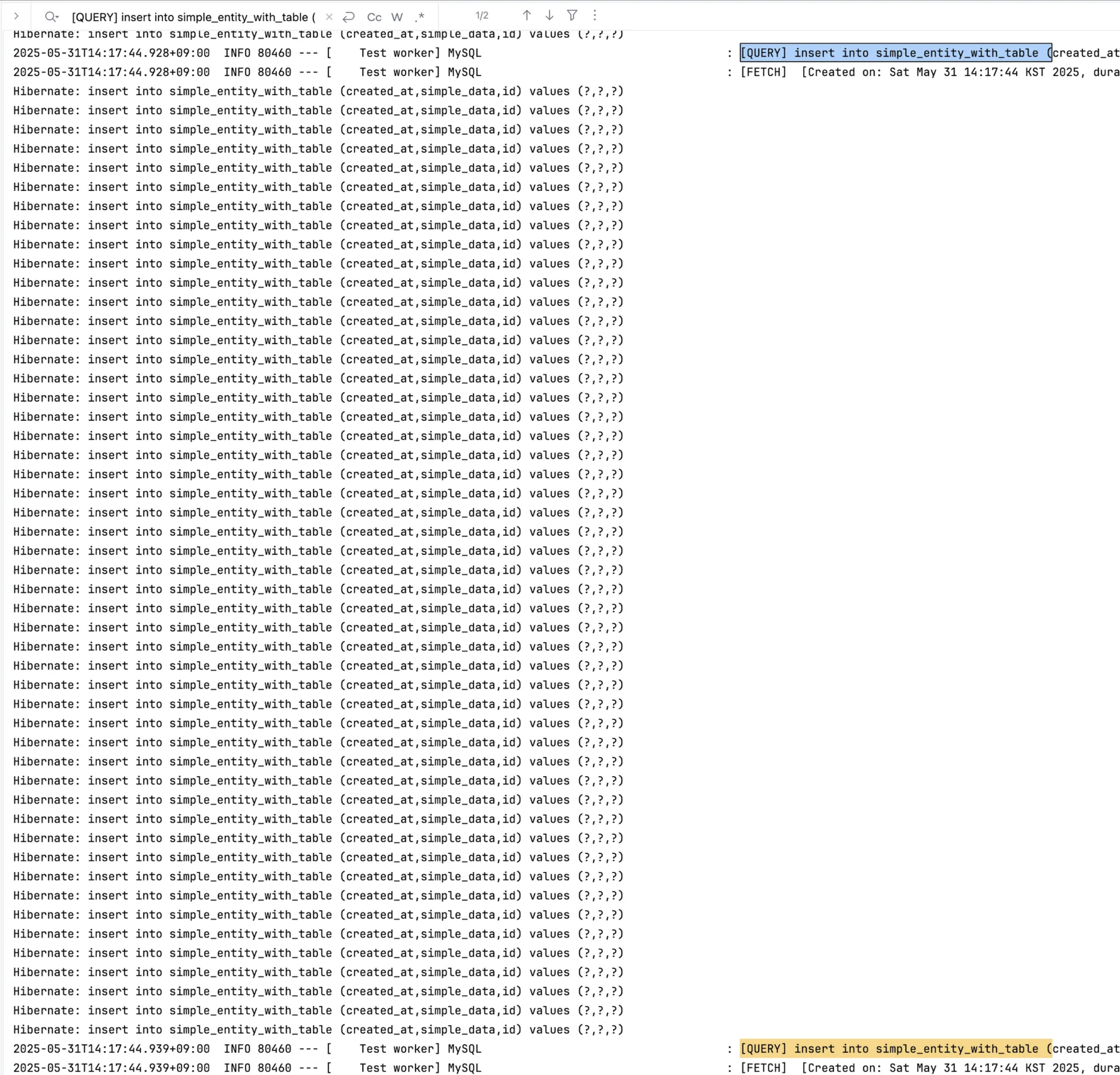 테스트에 로그 출력에 따른 병목현상이 생기지 않도록 쿼리 생성에 따른 로그는 모두 제거하고 수행했습니다.