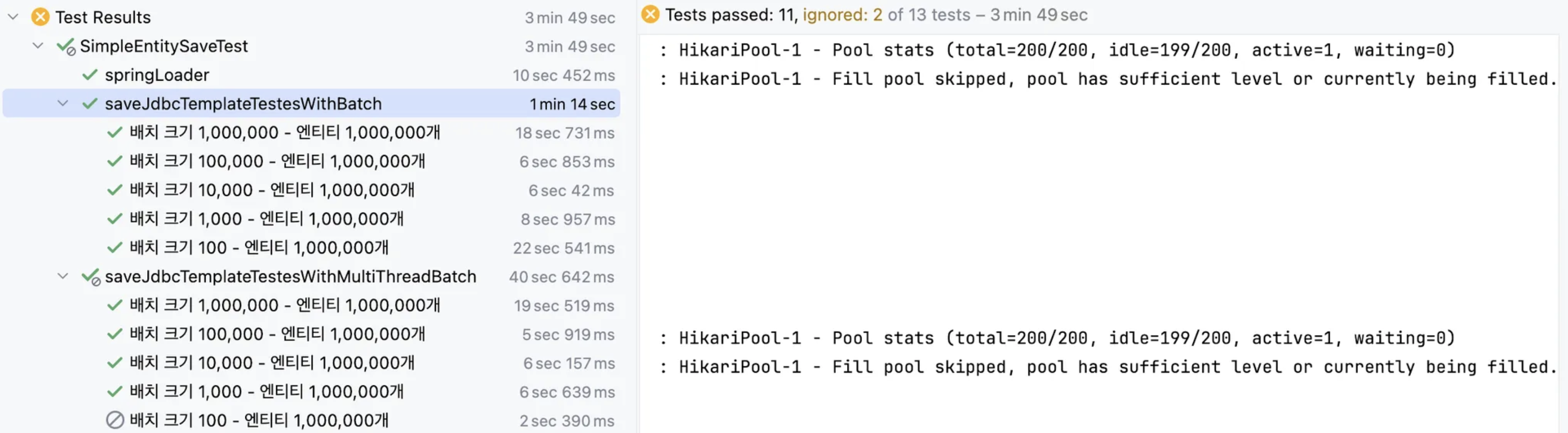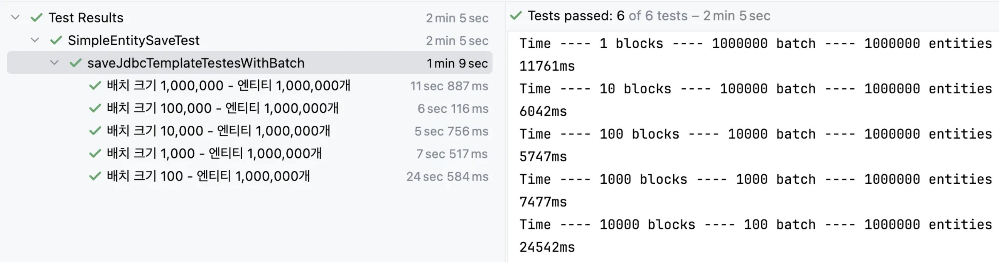 | 엔티티 개수 (배치 1개) | 1개 | 100개 | 10,000개 | 1,000,000개 |