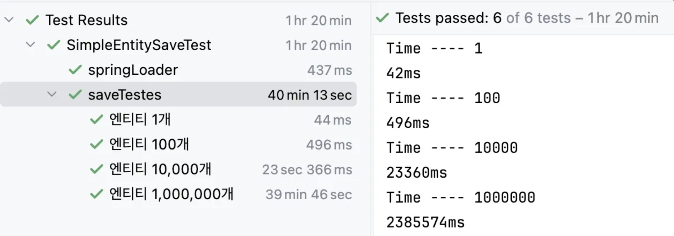 다음으로 다량의 엔티티를 저장할 경우 소모되는 시간에 대해서 알아보겠습니다.